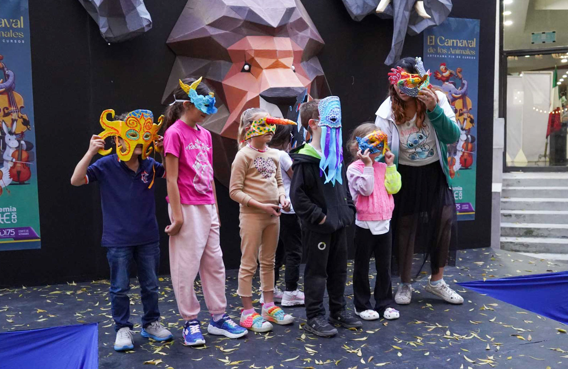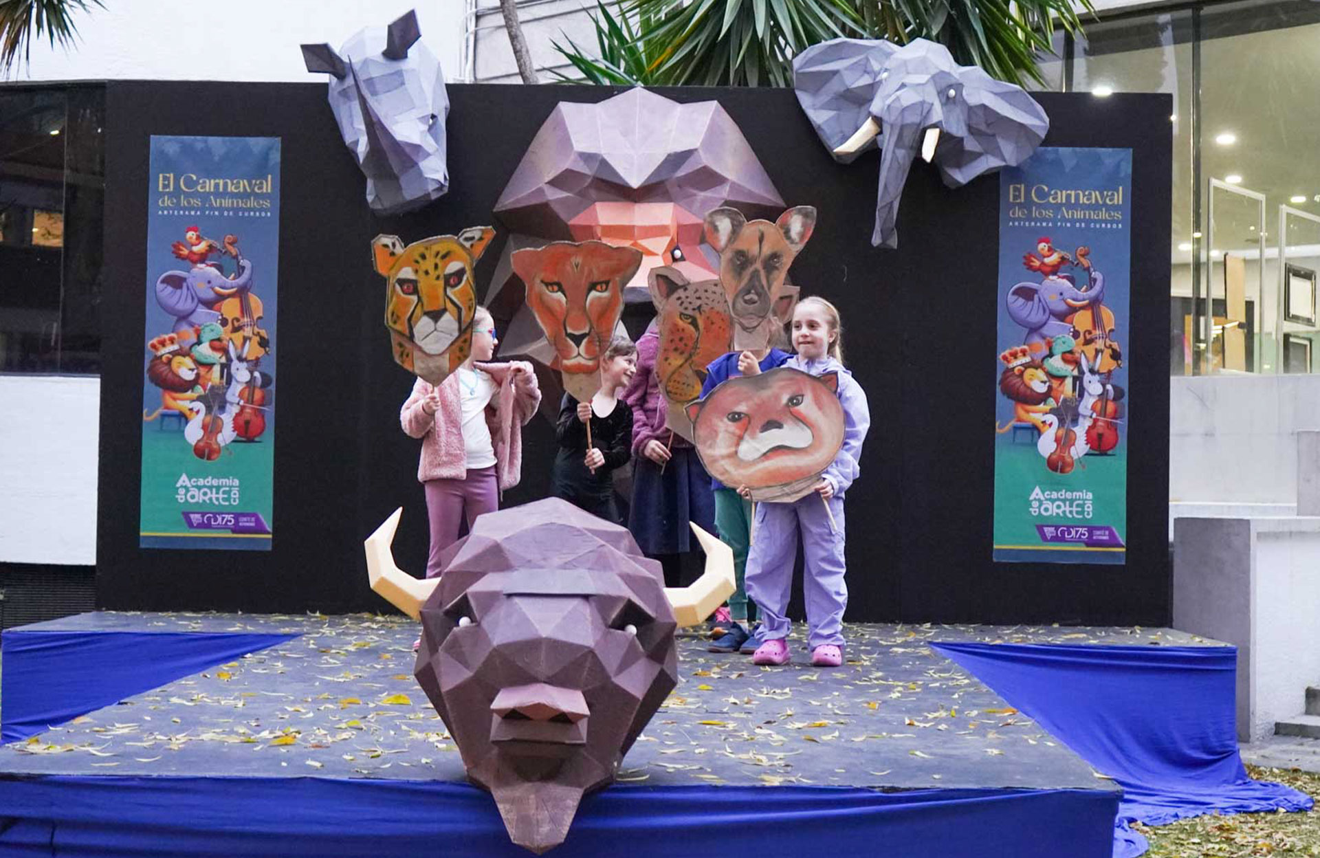 Uno de los momentos más esperados fue el gran desfile de máscaras, inspirado en el mágico Carnaval de los Animales. Esta actividad fue una fiesta de imaginación, en donde los estudiantes dieron vida a criaturas reales y fantásticas, jugando con texturas, formas y colores. Las máscaras, elaboradas con técnicas vistas en clase, representaron no solo animales simbólicos, sino también emociones, personalidad y la manera única en que cada niño percibe el mundo. Verlos desfilar fue presenciar cómo el arte se mueve, respira y cobra voz a través de ellos.