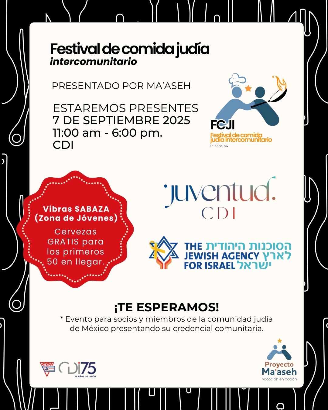 El próximo domingo 7 de septiembre de 2025, el CDI será el punto de encuentro para una celebración única: la 1ª edición del Festival de Comida Judía intercomunitario, un evento organizado por Ma’aseh.